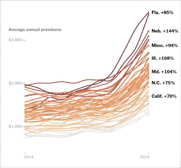 Insurance premiums in risk-prone states have surged dramatically as a result. In wildfire- and hail-prone Colorado, the average premium has more than doubled in the past decade, with median premiums rising 74% since 2020.