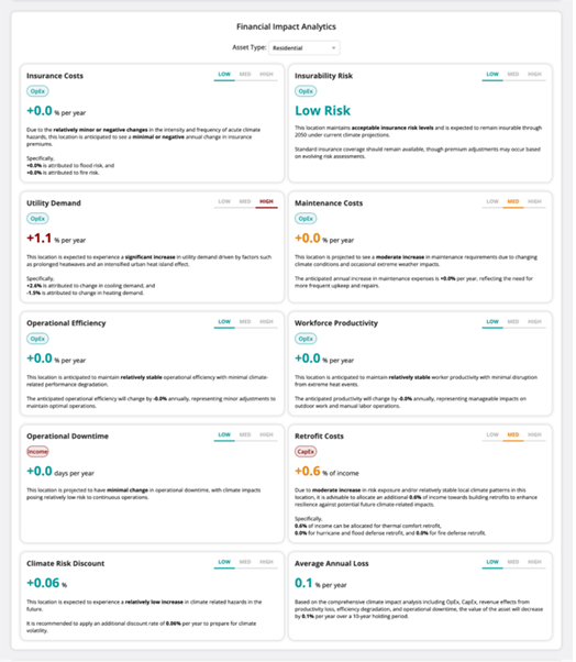 - Embed climate into financial models: AlphaGeo’s Financial Impact Analytics suite integrates directly with cash flow and valuation models. It adjusts for location-specific OpEx (for instance, rising insurance and utility costs) and CapEx (for instance, retrofit investments) and recalibrates discount rates to reflect climate uncertainty. These metrics can be calibrated for 9 asset types, spanning real estate and infrastructure.