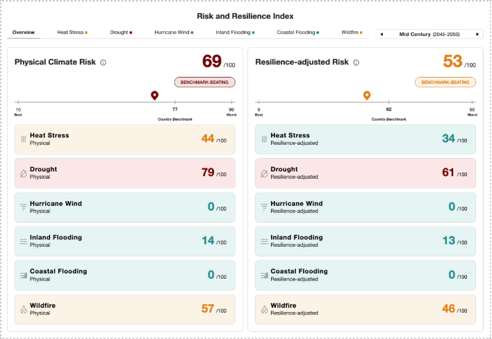 - Factor in local resilience: The Global Adaptation Layer enhances accuracy by incorporating real-world resilience infrastructure — such as seawalls, drainage systems and fire response networks — creating a “ground truth” view of actual exposure. This transforms generic hazard maps into investment-grade risk intelligence.