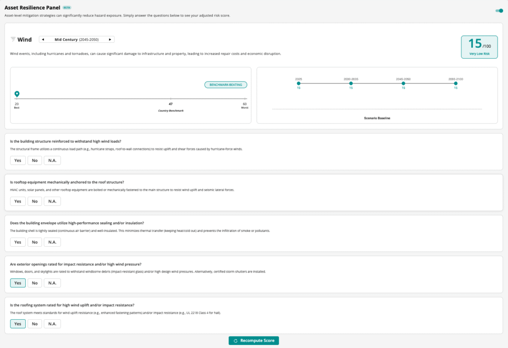 This is why we’re launching our latest tool, the Asset Resilience Panel (ARP), to help asset managers quantify the impact of asset-level adaptation measures on real-world risk. The Asset Resilience Panel synthesizes over 100 adaptation strategies from leading technical standards into a single, rigorous assessment tool. By integrating physical attributes and adaptation measures with our proprietary Climate Risk and Resilience Index (RRI) scores, the Panel re-computes an Asset-level Risk Score that reflects both locational exposure and asset-level resilience.