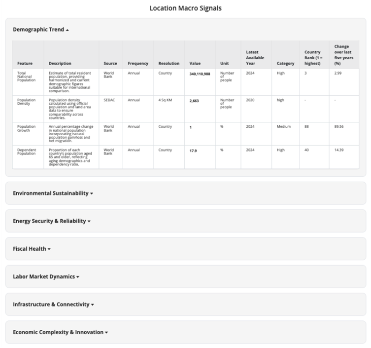 AlphaGeo’s Location Macro Signals is a geospatial macro-intelligence toolkit that curates and models the most important risk and opportunity drivers for global investors, corporates and other institutions. By consolidating, harmonizing, and downscaling data across macroeconomic, geopolitical, societal, technological and environmental domains, the platform delivers a comprehensive view of a location’s macro drivers – enabling faster, smarter, and more confident decision-making.
