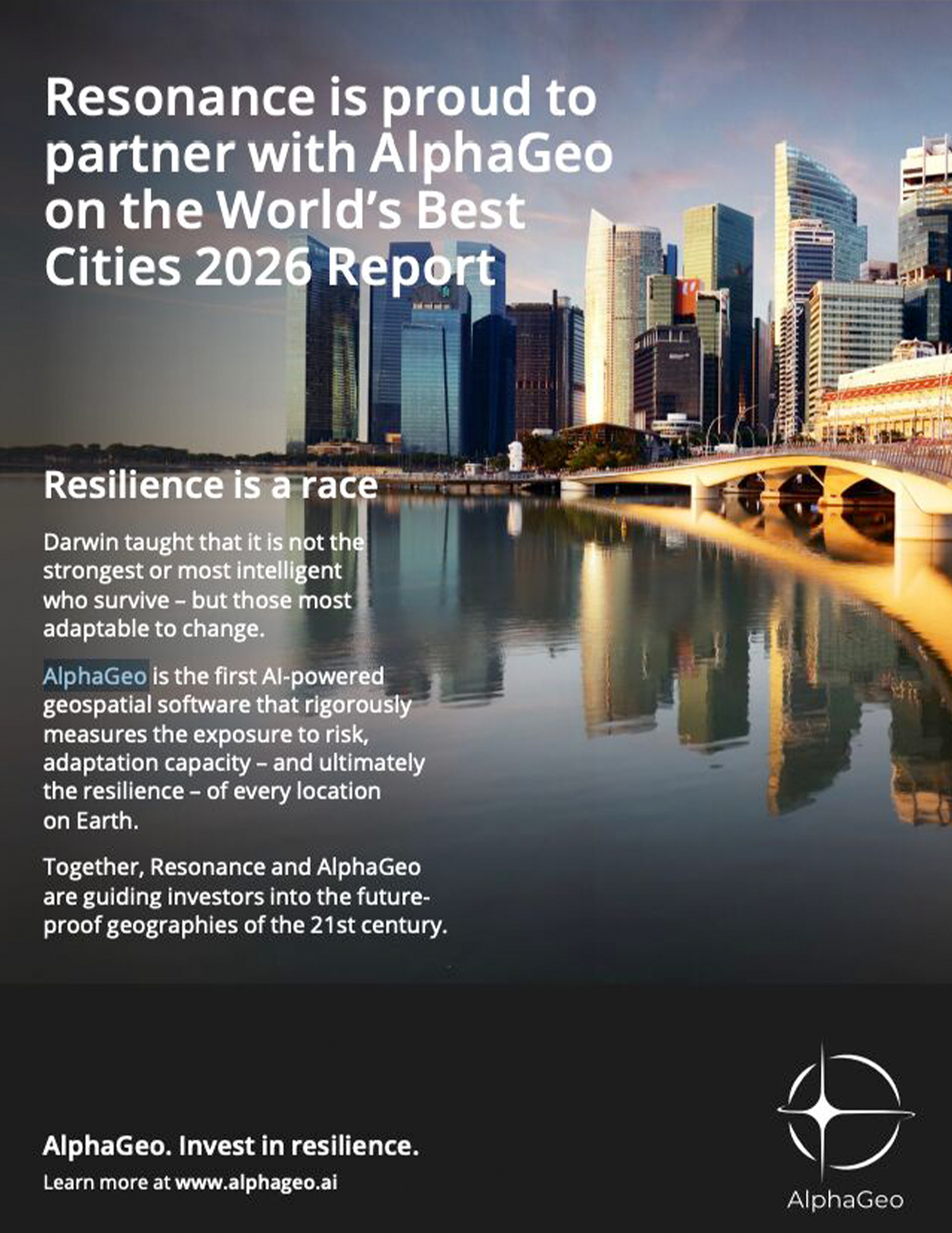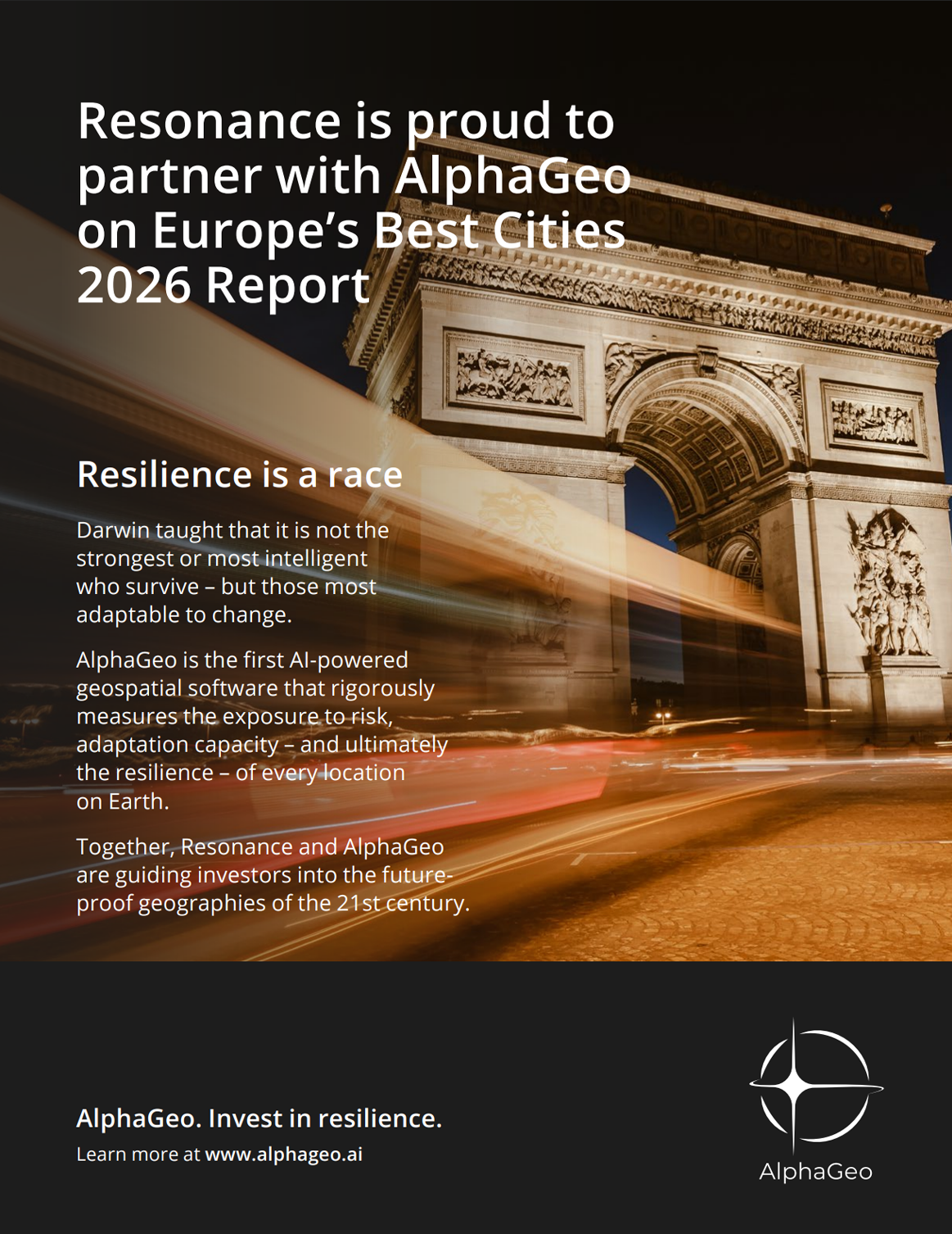 AlphaGeo partnered with Resonance to provide city-level climate resilience rankings for its 2025 The World’s 100 Best Cities report as well its subsequent reports covering Europe and other regions.