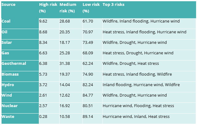 Coal power plants have the highest percentage of assets classified as high risk with wildfire, inland flooding, and hurricane wind posing greatest threats. Oil and solar plants follow closely behind.