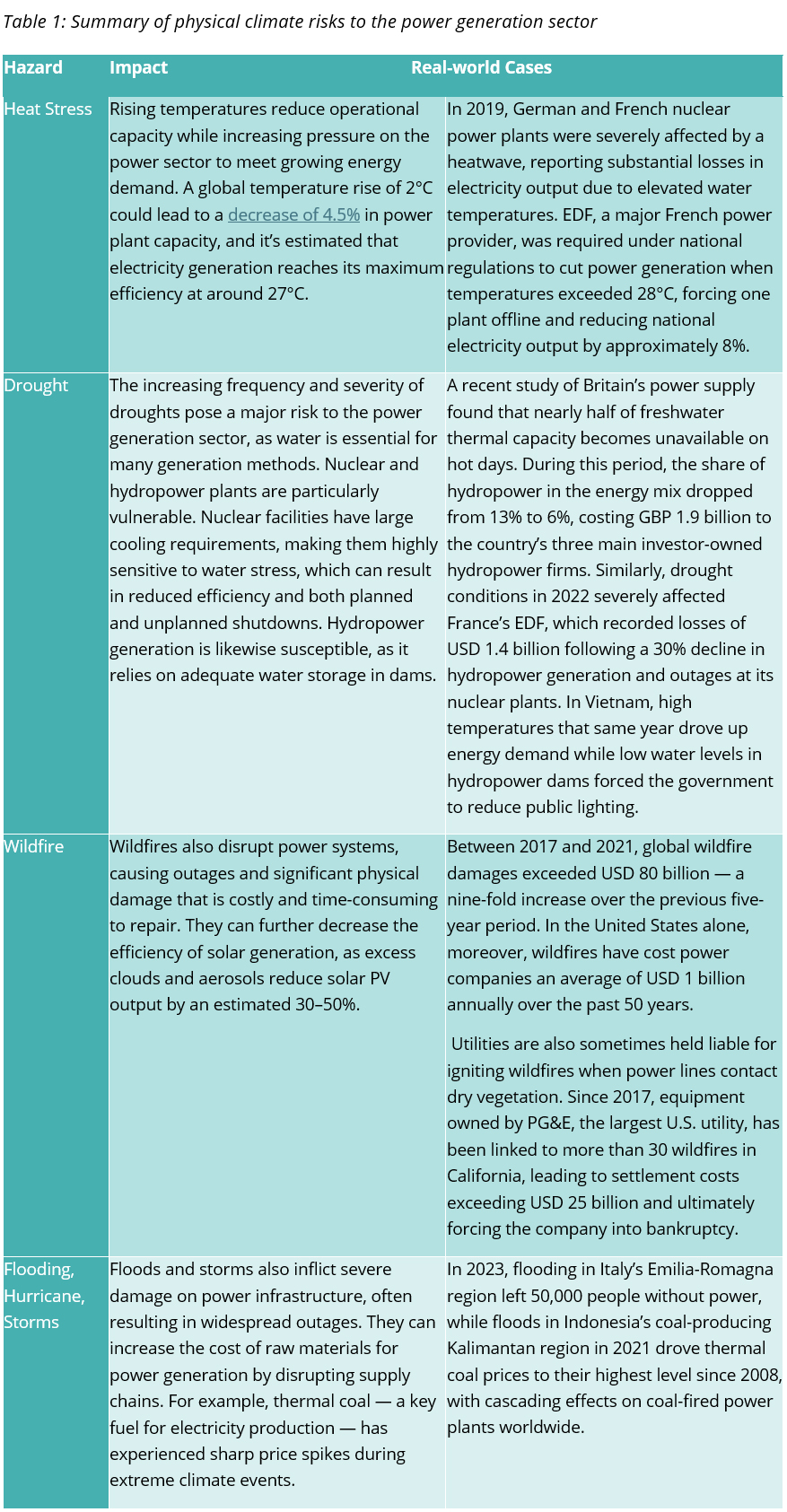 The table below summarizes the impacts of each hazard on the power generation sector, drawing on key findings from the UNEP report “Climate Risks in the Power Generation Sector”.