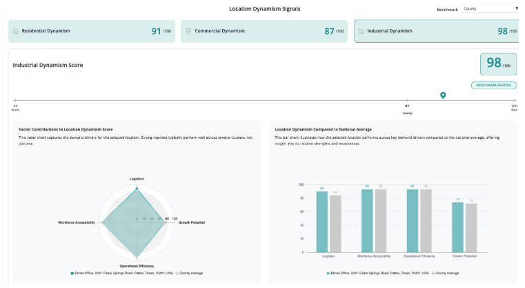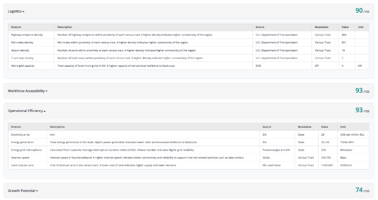 AlphaGeo’s Location Dynamism Signals product was built exactly for this. It generates an attractiveness score for industrial sites like data centers by combining data layers across logistical and infrastructure connectivity, workforce accessibility, operational and energy efficiency, renewable energy supply, climate exposure, and growth potential. Clients use it to rapidly filter hundreds of candidate locations down to a shortlist of high-conviction sites — or to stress-test a specific location with data-backed rigor before committing capital.